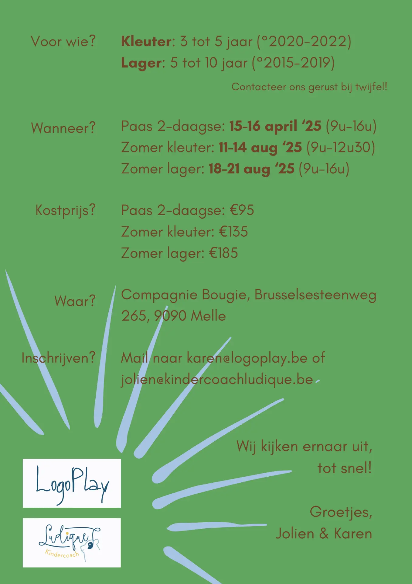 Stuur bij interesse een e-mail naar Jolien of Karen (jolien@kindercoachludique.be of karen@logoplay.be )